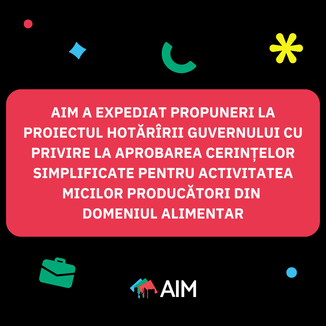 AIM A EXPEDIAT PROPUNERI LA PROIECTUL HOTĂRÂRII GUVERNULUI CU PRIVIRE LA APROBAREA CERINȚELOR SIMPLIFICATE PENTRU ACTIVITATEA MICILOR PRODUCĂTORI DIN DOMENIUL ALIMENTAR octombrie 10, 2024