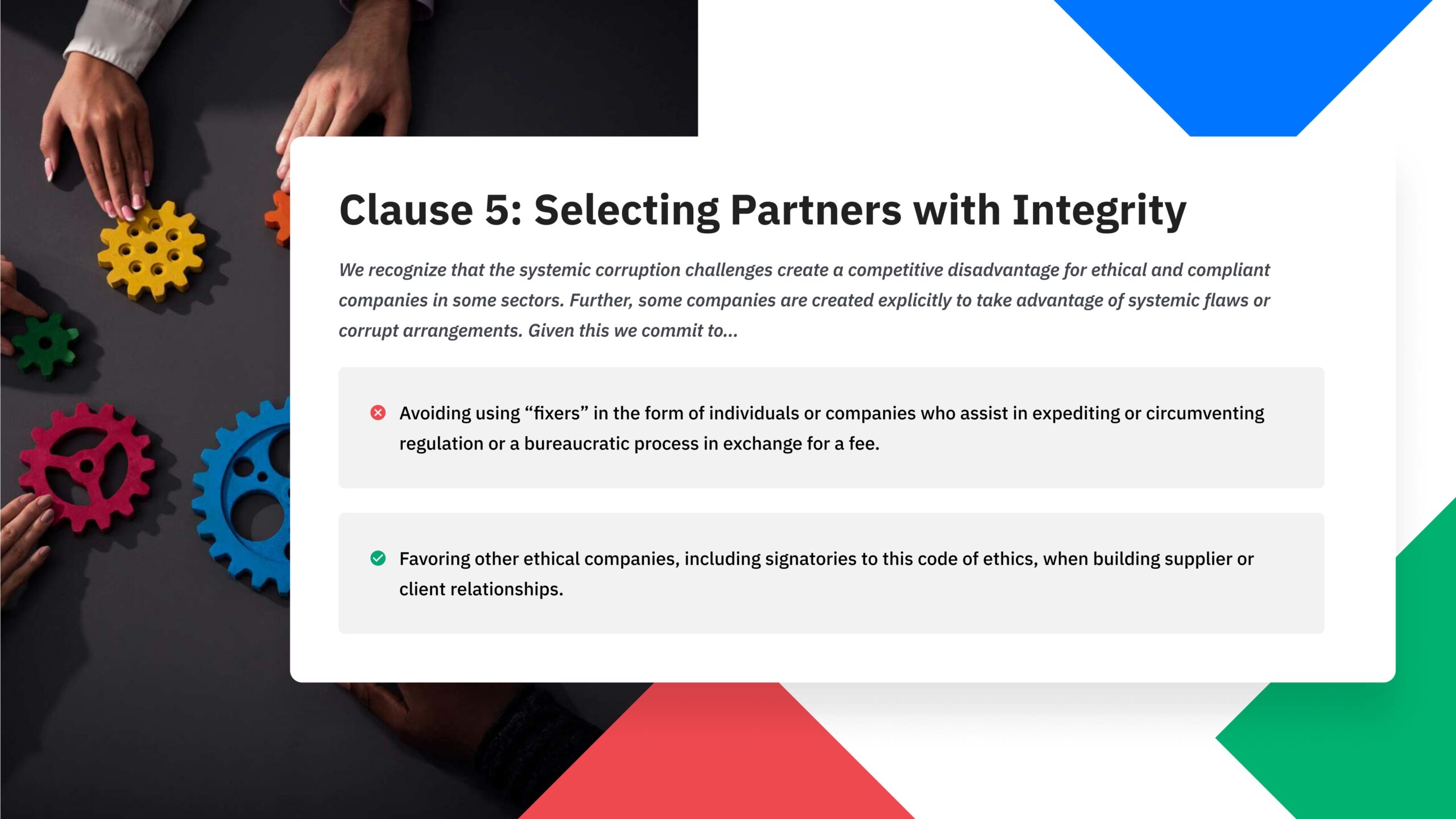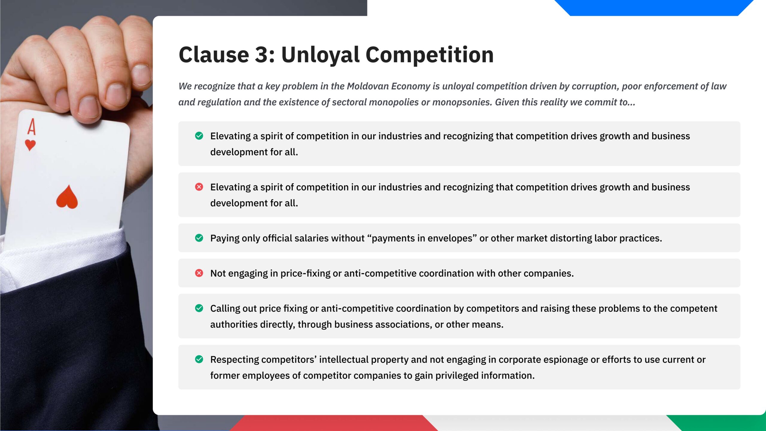 We understand that it is not just the duty of the authorities to pass laws to make entrepreneurs work honestly and transparently. It is also the duty of business people to make a social commitment, based on common principles and values, which would ensure honesty, transparency, healthy competition and integrity.